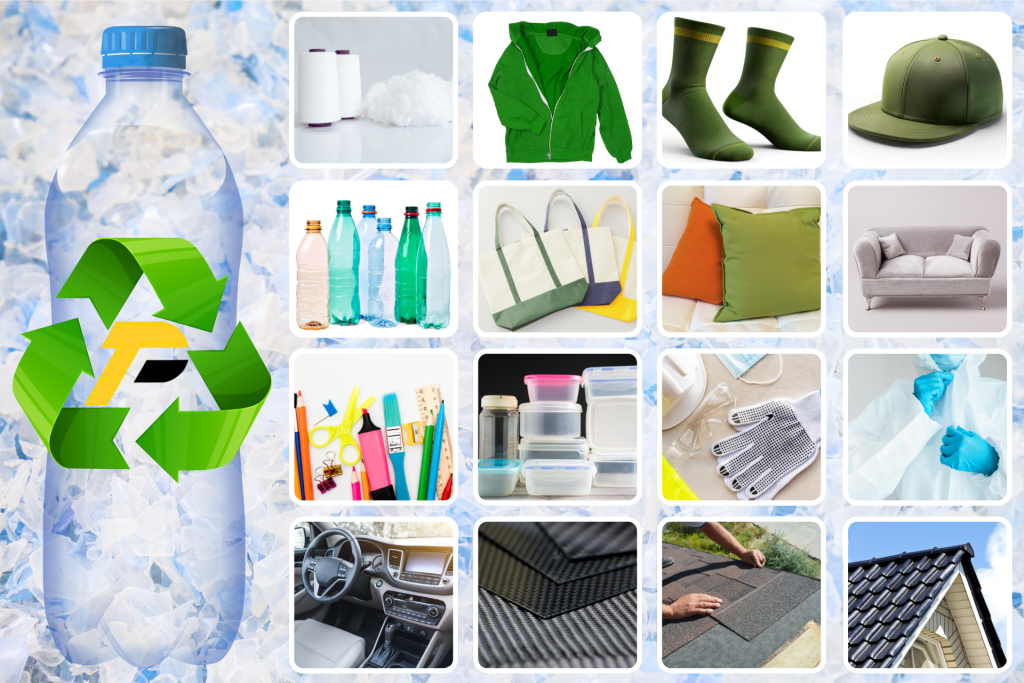 นี่คือหนึ่งในการใช้งานหลักที่น่าทึ่งที่สุดของ rPET เนื่องจากพลาสติก PET มีคุณสมบัติในการนำไปผลิตเป็น เส้นใยโพลีเอสเตอร์ (Polyester Fiber) ได้อย่างมีคุณภาพ สินค้าที่ผลิตได้ เช่น