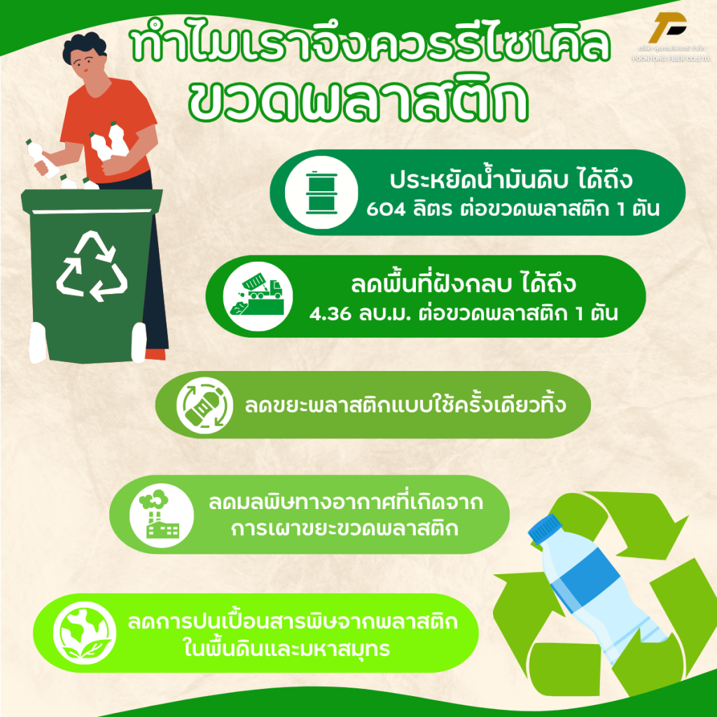 ขวดพลาสติกส่วนใหญ่ถูกออกแบบมาให้ใช้แล้วทิ้ง การรีไซเคิลช่วยเปลี่ยนขวดที่ถูกทิ้งให้กลายเป็นวัตถุดิบที่มีค่าสำหรับผลิตสินค้าอื่นๆ เช่น เสื้อผ้า เฟอร์นิเจอร์ หรือแม้แต่ขวดพลาสติกใหม่ การทำเช่นนี้เป็นการลดความต้องการในการผลิตพลาสติกใหม่ และช่วยลดปริมาณขยะพลาสติกที่จบลงในสภาพแวดล้อม